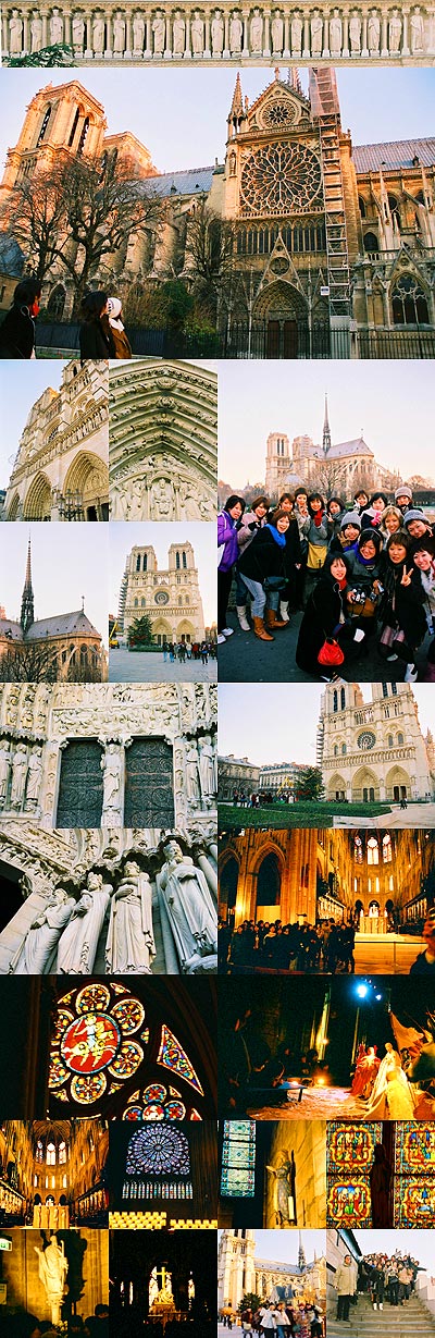 ノートルダム寺院に入った瞬間、ひらがなで「よこそう」と書いてありました。みんなで爆笑でした。きっと「ようこそ」って書きたかったんだろぉなぁ〜。何となくおしい。ノートルダム寺院の中はキャンドルが沢山あったり、ステンドグラスの窓(バラ窓など)がとぉーってもキレイでした。教会みたいにずらーっとたくさんの椅子が並んでいて、十字架があって、お祈りをしていました。外壁の彫刻も素晴しかったです。