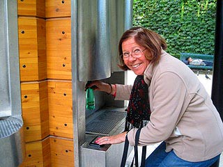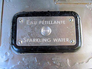 今まで私の知る限り、ガス入りの水はどれもペリエの様な天然水=ミネラルウォーターばかり、この水はどこの水?気になる所です。きっと皆さん同じでしょう。すると、これはなんとパリの水道水。この小屋の中に冷却機と水道の水にガスを入れる機械があり、普通の水道水がこんな風に。