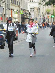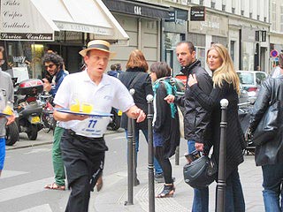 日曜日にカフェのギャルソンのレースが行われました。パリの伝統行事です。パリの中央のヴォージュ広場から10人づつが30秒毎のスタート。