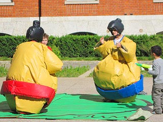 お相撲ごっこ。"もこもこ"の お相撲さんの着ぐるみが暑そうxxx。+カツラをつけて、「はっけよーい、のこった!」"もこもこ"の 大き過ぎる着ぐるみのせいで、飛び跳ねるも、歩くも、思いの侭にいかず、ご当人たちも、それを取り巻く子供たちも大笑い。