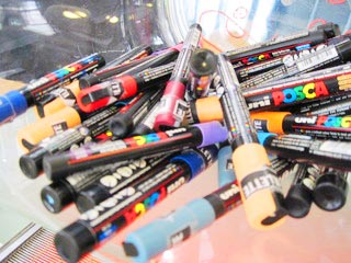 ここでは、こんなペイントマーカーがいっぱい用意されていました。うちでこれだけ揃えるのは大変だけど、これだけ いろんな色が揃っていると発色も良くって、ちょっと贅沢な遊び感。。。とは、お財布を持つ様になった大人だけかしら?