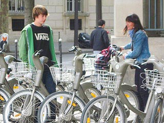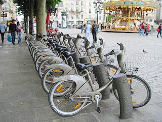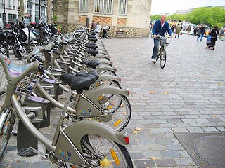 あれから時が過ぎ。。。4年前からパリ市が地球温暖化や環境保護(=渋滞、排気ガス、騒音などの自動車の弊害を減らす)にむけて、貸し自転車事業=ベリブVelib:に乗り出しました。このネーミングは自転車=Velo(ヴェロ)と自由=Libre(リーブル)を組み合わせた造語。