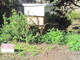 これはアーティストの一人が始めた養蜂です。「"蜂に注意"のフダは冗談じゃないのよ」。それを聞いて良く見ると、ナルホド、、、蜂がブンブン出たり入ったり。