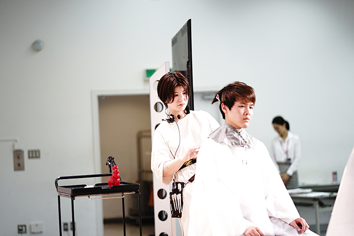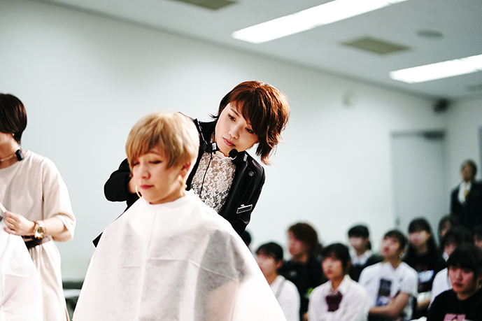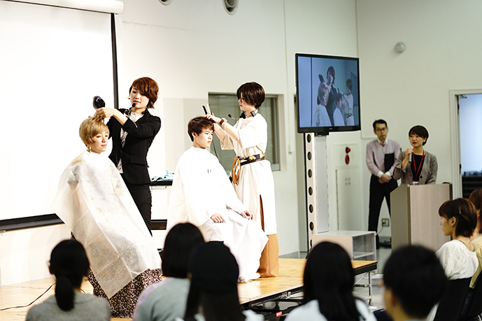 この“理容体験”、渋谷校本年度3回目となる開催で“目玉”は“卒業生ステージ”。今回は『ZA/ZA』OMOTESANDOよりスタイリストの新庄美里さん、『THE BARBER』NIHONBASHI TAKASHIMAYA S.C.よりスタイリストの塚田美帆子さんを迎えてのステージで、モデルを男女分けし、共に“ショートスタイル”をご披露いただきました。