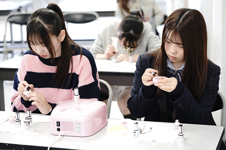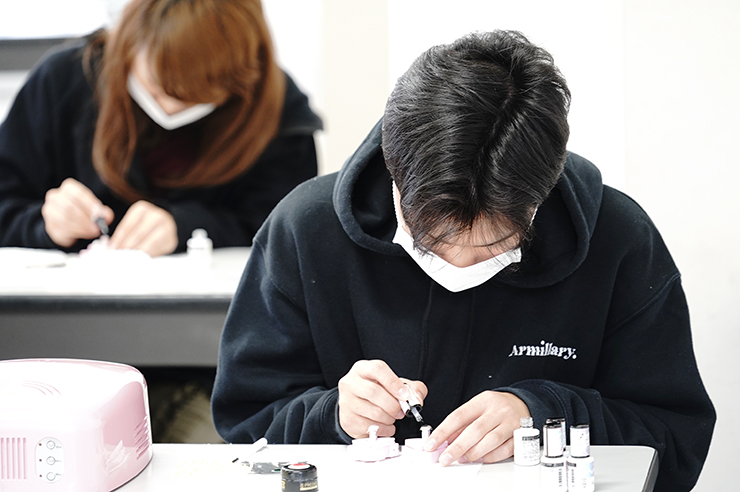 授業の内容が[ロングヘア]と[ネイル]を扱うことだったためか、女子の参加者は比較的手馴れた[手つき]で[施術]に取り組んでいる様子だったが、ただ一人参加していた男子は悪戦苦闘しているようで「難しいです...」と苦笑い。