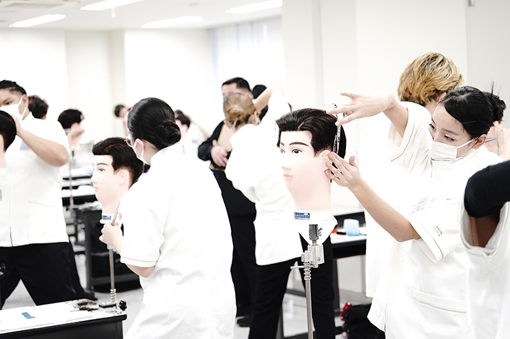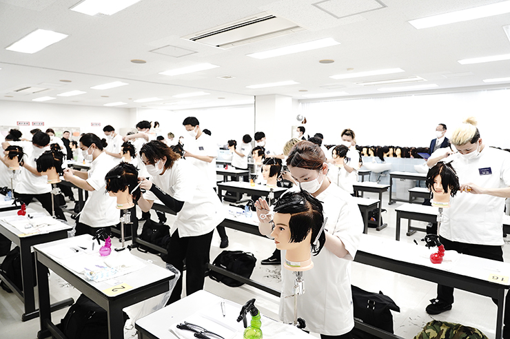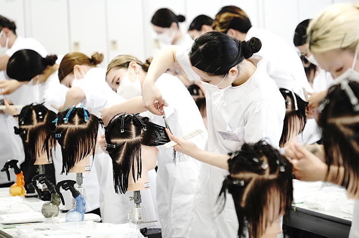 本学(国際文化理容美容専門学校 渋谷校/国分寺校)では、11月末から12月頭にかけての一週間に2年生(142期)と1年生(144期)の『二学期末実技試験』が行われ、この時ばかりは普段カメラを向けるとピースサインで応えてくれる学生も、真剣な眼差しでウィッグ(人頭人形)に対峙しているのが印象的だった(そりゃそうだ)。
