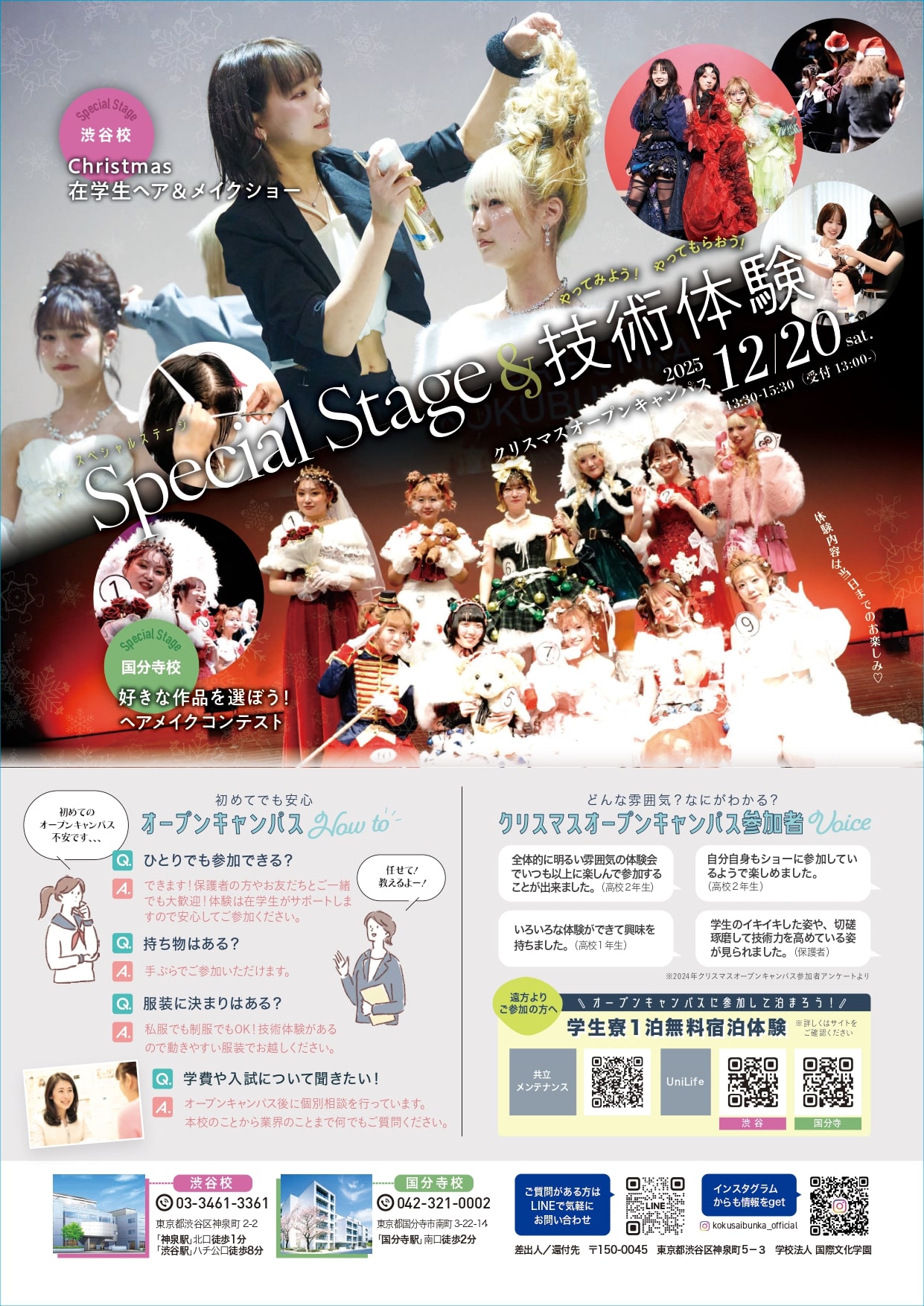 (クリスマス時期だけの、特別な体験入学会です。美容&理容、メイク、コスメ、ブライダルに関わる仕事・・・これから学校選びをする皆様が対象のイベントです。当日は『技術体験』の他に、ワクワク/感動の『クリスマススペシャルステージ』を実施いたします。美容・理容専門学校ならではクリスマスをお楽しみください。渋谷・国分寺の両校で開催いたします。