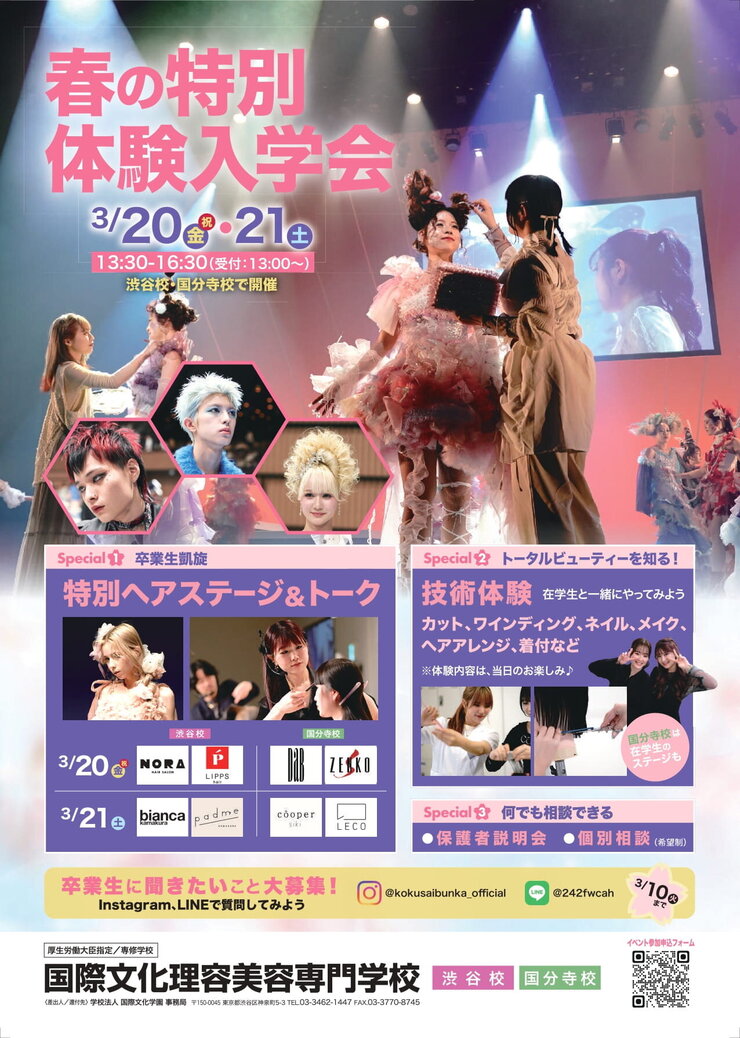 国際文化理容美容専門学校渋谷校と国際文化理容美容専門学校国分寺校では、春の特別体験入学会を開催いたします。